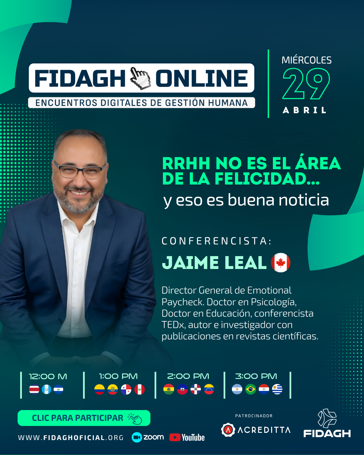 Este miércoles 29 de abril conéctese a FIDAGH Online y participe en la conferencia “RRHH no es el área de la felicidad… y eso es buena noticia”, junto a Jaime Leal: una mirada provocadora y necesaria sobre el verdadero rol de la gestión humana, sus límites, responsabilidades y su impacto real en la cultura y los resultados de la organización.